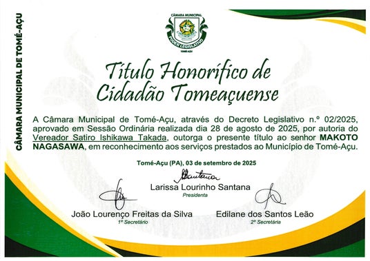 同市は当社のサプライヤーであるトメアス総合農業協同組合(以下「CAMTA」)の本拠地であり、CAMTAの乙幡理事長の推薦により市議会の承認を得て授与が決定されました。