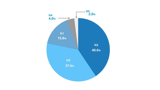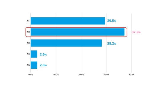 日本語能力試験(JLPT)の資格を持っていると回答した方に、取得級を尋ねたところ「N2」が最も多く37.2%となりました。次いで「N1」が29.5%、「N3」が28.2%で、いずれも同程度の割合となっています。「N4」「N5」はそれぞれ2.6%にとどまりました。