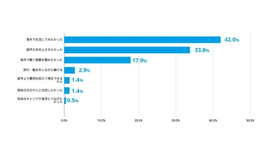一方で「旅行・観光をしながら働けるから」(2.9%)や「留学より費用を抑えて滞在できるから」(1.4%)、「現地の文化や人と交流したかった」(1.4%)、「将来のキャリアや進学につなげたかった」(0.5%)といった理由は少数にとどまりました。