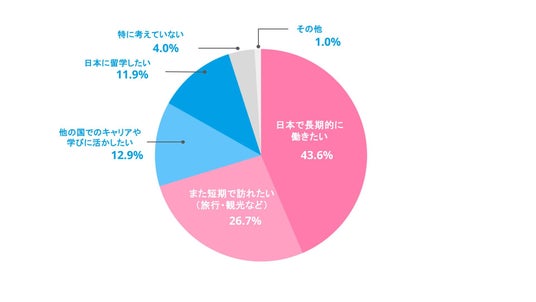 日本での経験を経て今後どのように日本とかかわりたいかを尋ねたところ、最も多かったのは「日本で長期的に働きたい」(43.6%)でした。次いで「また短期で訪れたい(旅行・観光など)」(26.7%)、「他の国でのキャリアや学びに活かしたい」(12.9%)、「日本に留学したい」(11.9%)が続きました。