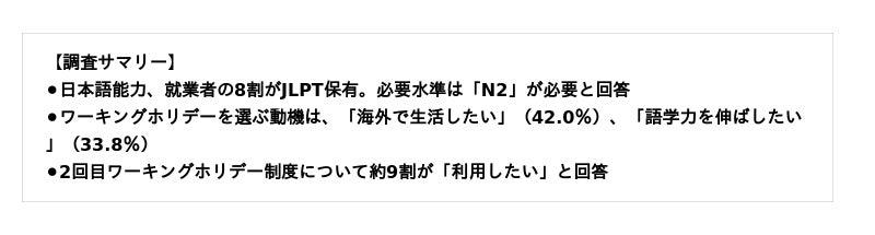 今回の結果から、ワーキングホリデーは観光や一時的な滞在目的ではなく、「実際に生活してみたい」「語学力を高めたい」といった実質的な動機で選ばれていることが明らかになりました。