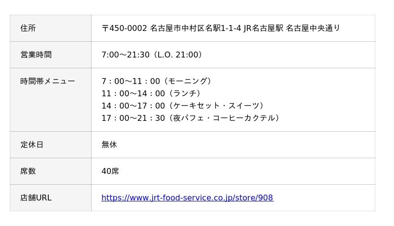 ジェイアール東海フードサービス株式会社(本社:愛知県名古屋市、代表取締役社長:岩下賢一)は、2025年11月4日(火)7:00、JR名古屋駅中央通りにて『喫茶 ボン・ヴォヤージュ』を復活オープンいたします。かつて名古屋駅で多くのお客様に愛された名物喫茶が、約20年の時を経て帰ってきます。今回の復活は、昔をなぞるだけの「レトロ」ではなく、懐かしさに新しさをプラスした――"ニューノスタルジー名古屋喫茶"。名古屋駅で本当に営業していた純喫茶の再来として、世代を超えて愛される新しい喫茶文化を創造。そして、お客様から熱いご要望をいただいていた名物スイーツ「シャチボン」も、満を持して復活いたします。新しい時代に蘇る、懐かしくて新しい喫茶体験をぜひお楽しみください。