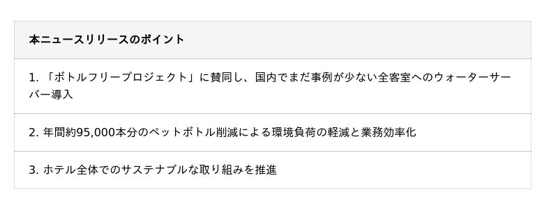 野村不動産ホテルズ株式会社(本社:東京都港区/代表取締役社長:石井康裕、以下「当社」)が運営する「ノーガホテル 清水 京都(以下「ノーガホテル京都」)」は、環境保護を目的とした使い捨てプラスチックゴミ削減のために、ウォータースタンド株式会社(https://waterstand.co.jp/)が推進する「ボトルフリープロジェクト」に賛同の上、ペットボトルの客室設置を廃止して、2025年9月より、水道水を浄水し提供する電気を使用しない水道直結型ウォーターサーバーを全客室に設置しました。