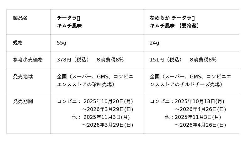 今回、寒くなる秋~冬にかけてぴったりの味わいが楽しめる「チータラ(R) キムチ風味」と「なめらか チータラ(R) キムチ風味」を発売いたします。