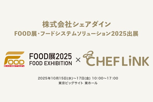 株式会社シェアダイン(本社:東京都港区、代表取締役:飯田陽狩)は、2025年10月15日(水)~17日(金)に東京ビッグサイト東ホールで開催される「FOOD展/フードシステムソリューション(F-SYS)2025」に出展いたします。展示ブース(小間番号:T-13)では、学校・病院・高齢者施設など給食・大量調理領域に向けて、料理人と飲食事業者をつなぐ総合プラットフォーム「CHEFLINK(シェフリンク)※」の導入可能性をご提案し、給食現場における人手不足・運営効率化へのソリューションを訴求していきます。