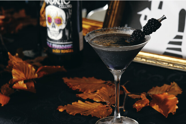 「ハロウィンナイトカクテル」は、爽やかなシトラス、ベリーフルーツ、チャーミングなすみれの香りが漂います。ブラックパールリキュールとバイオレットでダークな夜空を表現した見た目とのギャップをお愉しみください。