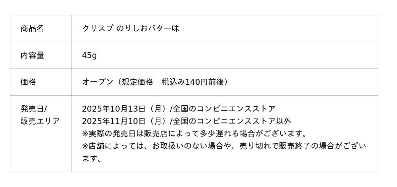 カルビー株式会社(本社:東京都千代田区、代表取締役社長兼CEO:江原 信)は、“ザクッ”とした食感が特長の成型ポテトチップス※1「クリスプ」から、のりの香りとコクのあるバターの味わいが楽しめる『クリスプ のりしおバター味』を2025年10月13日(月)から全国のコンビニエンスストア先行で期間限定発売します。コンビニエンスストア以外の店舗では、2025年11月10日(月)から発売します(2026年1月下旬終売予定)。