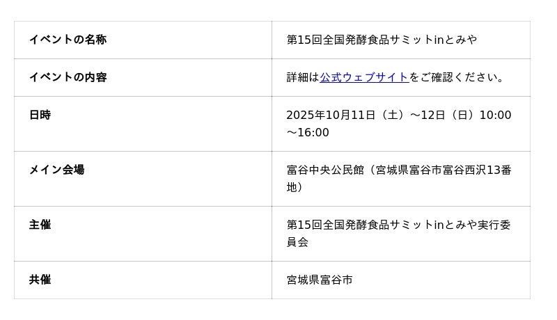 第15回全国発酵食品サミットinとみや実行委員会(富谷市経済産業部産業観光課内)は、宿場町の歴史を背景に地域性の豊かな発酵文化を有する宮城県富谷市にて、発酵に関する基調講演やトークショー、ワークショップやマルシェなどを通じ発酵の魅力を訴求する 「第15回全国発酵食品サミットinとみや」 を開催します。