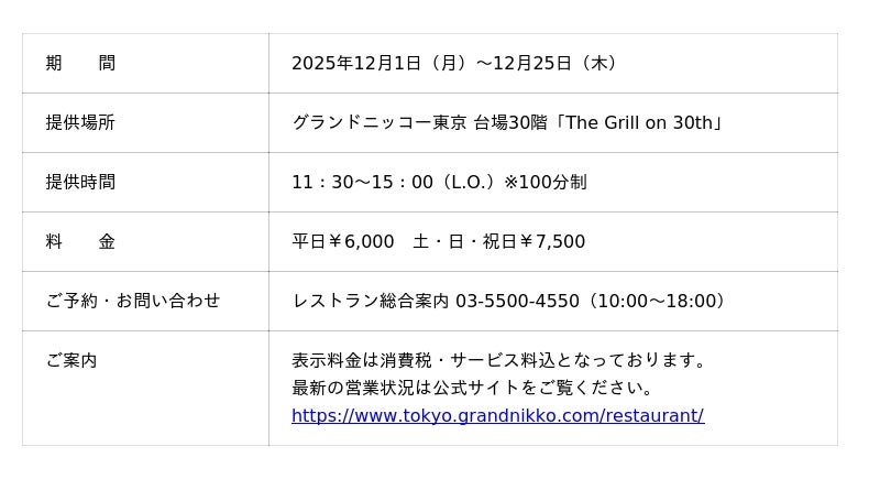 「東京を楽しむ 東京をくつろぐ」ひとときをお届けするグランドニッコー東京 台場(住所:東京都港区 総支配人:塚田 忠保)は、ホテル最上階から東京湾の美しい景色を望む「The Grill on 30th」にて、2025年12月1日(月)~12月25日(木)の期間、ホリデーシーズンを彩る『ノエル・エレガンスランチ&デザートブッフェ』を提供します。