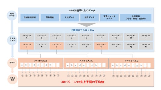 新規出店検討の際、店舗の広さや位置・形態等の店舗基礎情報、国勢調査、人流データ、交通センサスデータ、河川等の地理的情報などの4万以上のインプットデータをもとに約18種類のアルゴリズムの中から該当店舗のアルゴリズムを特定し、状況にあった30パターンの売上予測を算出。これらの平均値をとることで、新規出店店舗の年間の売上予測を立てていきます。