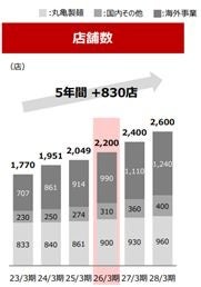 国内において、建築資材の高騰やコロナ禍後の外食市場活性化に伴う競争激化等により出店のハードルは高まっていますが、2025年度は国内において1,210店舗(丸亀製麺900店舗+国内その他310店舗)を目指しています。