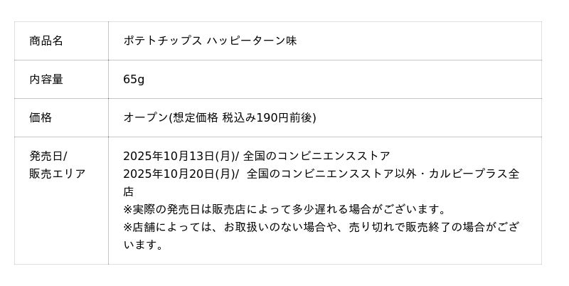 カルビー株式会社(本社:東京都千代田区、代表取締役社長兼CEO:江原 信、以下、カルビー)は、亀田製菓株式会社(本社:新潟県新潟市、代表取締役社長COO:高木 政紀、以下、亀田製菓)との協働プロジェクトの第1弾として、それぞれコラボレーション商品を発売します。カルビーからは、亀田製菓の人気ブランド「ハッピーターン」の味わいを再現した『ポテトチップス ハッピーターン味』を、2025年10月13日(月)から全国のコンビニエンスストア先行で期間限定発売します(同年11月下旬終売予定)。コンビニエンスストア以外の店舗では、2025年10月20日(月)から数量限定発売します(なくなり次第終了)。