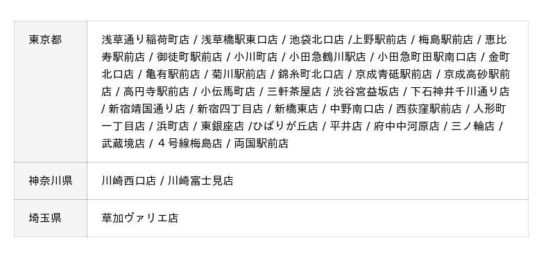 以下の39店舗に設置完了しており、本日以降で関東エリア全域の店舗に設置予定です。