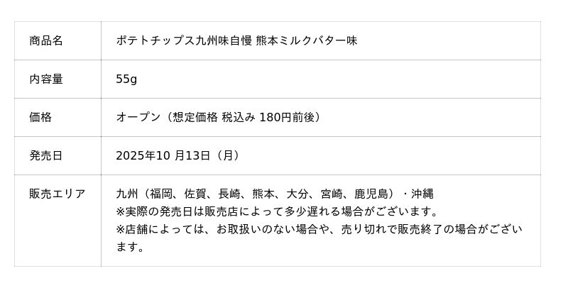 カルビー株式会社(本社:東京都千代田区、代表取締役社長兼CEO:江原 信)は、九州の素材を活かして味付けした「ポテトチップス九州味自慢(以下、九州味自慢)」シリーズから、熊本県の生乳から作ったバターを100%使用(※1)した『ポテトチップス九州味自慢 熊本ミルクバター味』を2025年10月13日(月)から九州エリアで期間限定発売します(2026年4月上旬終売予定)。また、沖縄では数量限定発売します。