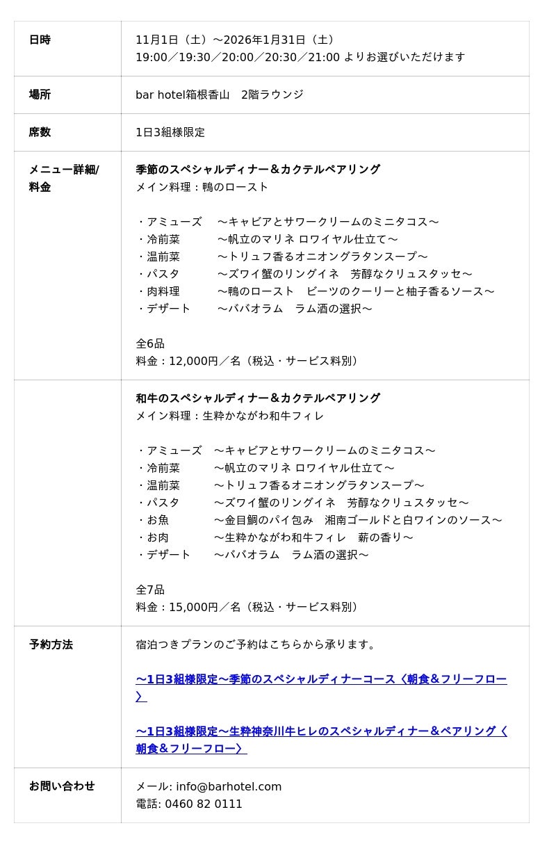 シマダグループ(東京都渋谷区、代表:島田成年)が運営するbar hotel箱根香山(神奈川県箱根町小涌谷)では、2025年11月1日(土)~2026年1月31日(土)の期間、施設2階のラウンジにて、冬のディナーコースをご提供いたします。各料理には、当館バーテンダーによるオリジナルカクテルをペアリング。お料理とカクテルのマリアージュをぜひご堪能ください。1日3組様限定の特別なひとときをどうぞ。