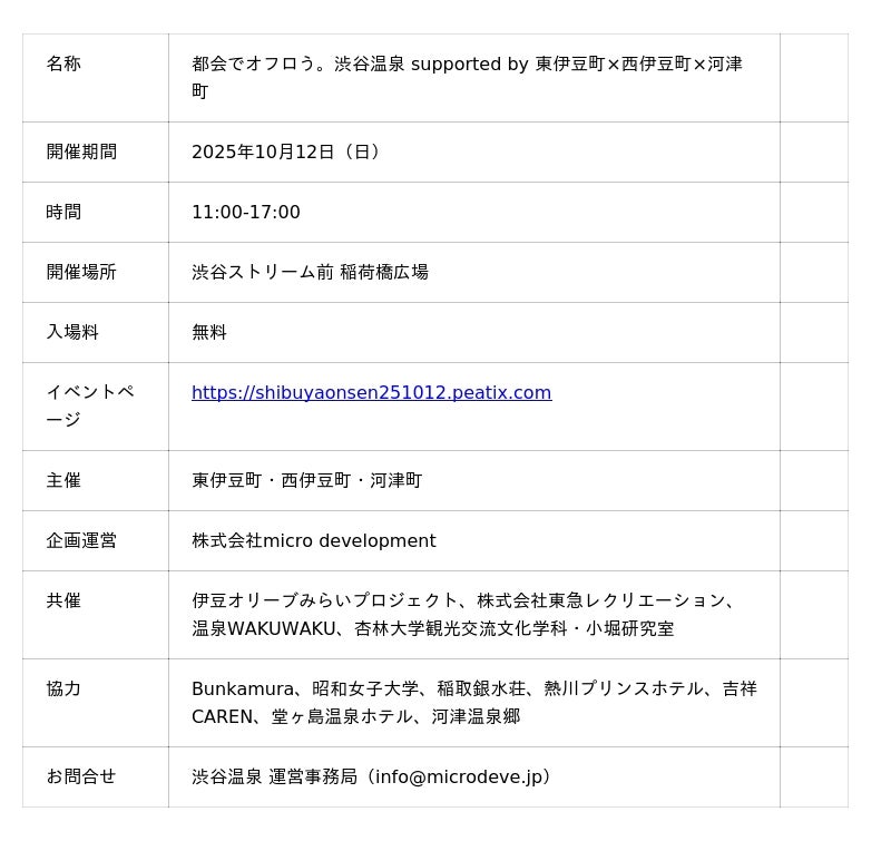 フェア最終日となる2025年10月12日(日)には、渋谷ストリーム前「稲荷橋広場」にて、伊豆半島の源泉を持ち込んだ「足湯温泉パーク」を出現させ、都会で暮らす方々に、秋の休日に日頃の疲れを癒す、オフなひとときを提供します。