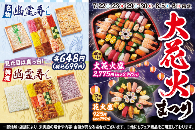 暑い夏にピッタリ!!夜空に咲く大輪の花のように華やかな『大花火まつり』の「大花火盛」などと、毎年大人気の『幽霊寿し』をご用意しました!