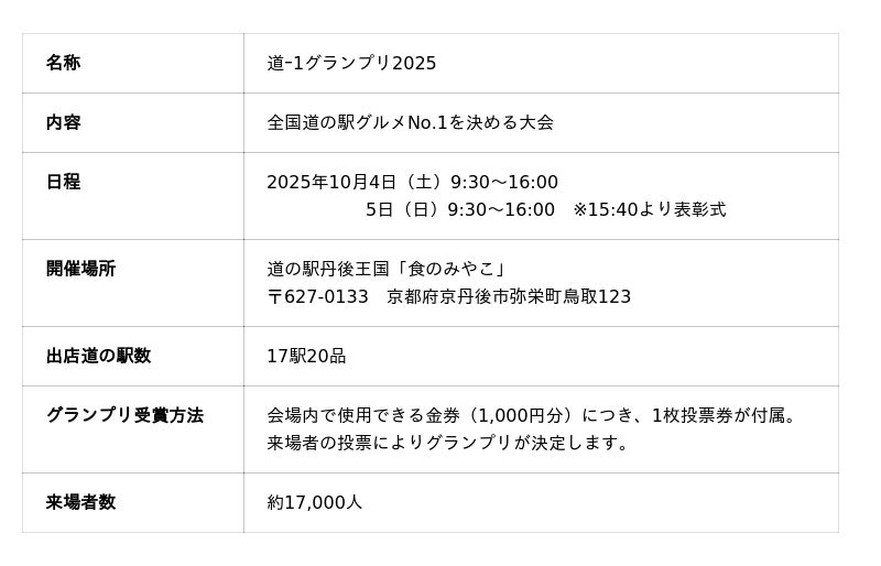 2016年より国内最大級の道の駅グルメイベントとして、日本各地の食の魅力を届けてきた「道-1グランプリ」。第7回目の開催となる今大会も京都府京丹後市にある、道の駅丹後王国「食のみやこ」にて開催。前回グランプリを獲得した道の駅かさま(茨城県)をはじめ、全国から17の道の駅(20品)が丹後の地に駆けつけました。