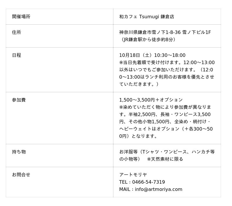 【10/18(土)】和カフェ Tsumugi 鎌倉店×アートモリヤ 藍染ワークショップを開催!