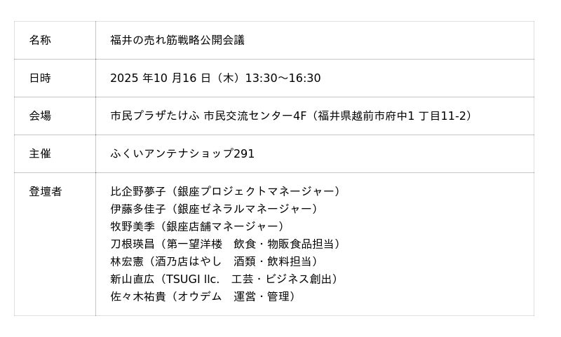 当日は、銀座・南青山両店舗の現場を熟知したスタッフが登壇し、「東京で福井がどう受け止められているか」を具体的な販売データや実例をもとに語ります。