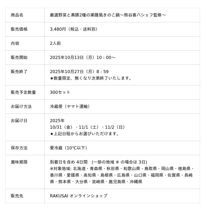 楽彩株式会社(本社:東京都足立区/代表取締役社長:大崎善保)は、日本のフランス料理界を牽引してきた「KIHACHI」創業者 熊谷喜八シェフ監修の『厳選野菜と黒豚2種の薬膳風きのこ鍋』を、2025年10月13日(月)10:00より公式オンラインショップにて、300セット限定で販売開始いたしました。