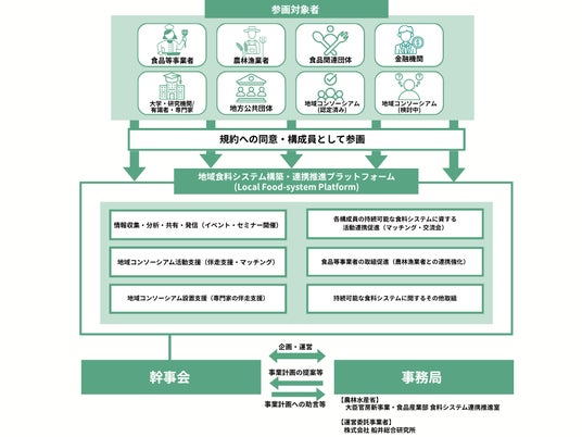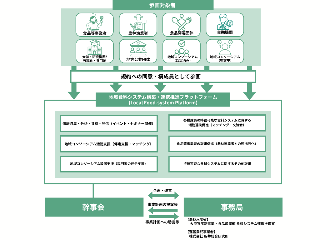 本プラットフォームは、地域の持続可能な食料システムの構築に取り組む多様な関係者が連携・参画する場です。地域コンソーシアム、地方公共団体、食品関連団体、金融機関、大学・研究機関などの支援機関や団体に加え、農林漁業者や食品事業者等の事業者が、それぞれの立場で地域の食品産業の振興に取り組みます。