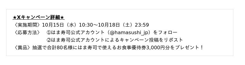 はま寿司公式Xでは、フェア開催を記念して、抽選で合計80名様にはま寿司で使えるお食事優待券