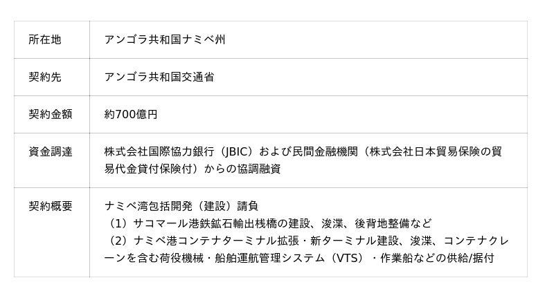 ナミベ港は、モサメデス鉄道の起点として内陸部と結ぶアンゴラ共和国南部の重要な物流拠点ですが、従来は岸壁の水深が浅く、大型コンテナ船の寄港が困難で、隣国ナミビアのウォルビスベイ港に輸出入の一部を依存していました。