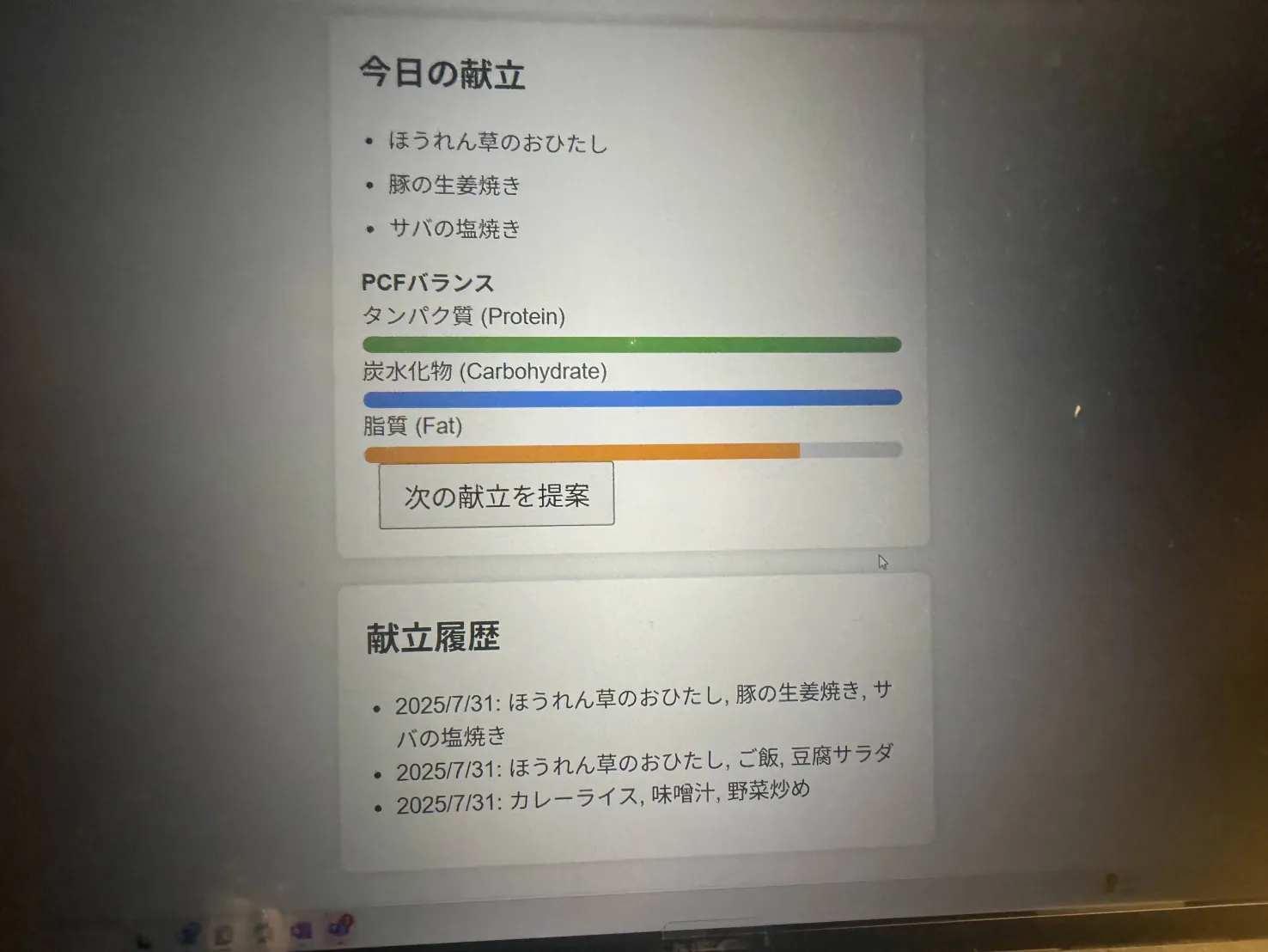 栄養バランスを考慮した献立管理システム。PCF(タンパク質・炭水化物・脂質)バランス表示により、健康管理を支援する実用的なアプリケーションです。