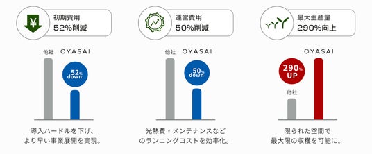 OYASAI FARMは従来の方法に比べて初期費用を大幅に削減し、さらに運営コストも抑えながら、生産量を大きく向上させることが可能です。