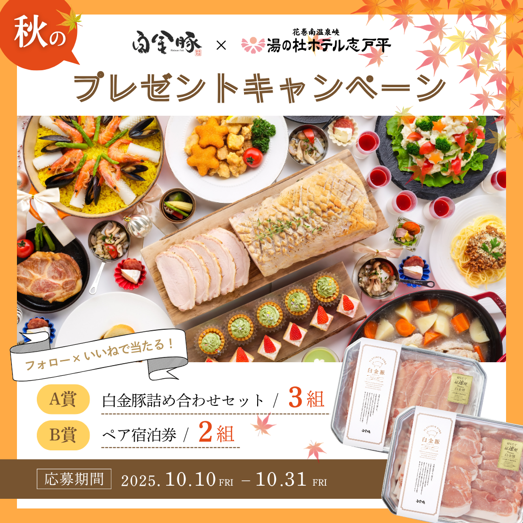 インスタグラムにて、プレゼントキャンペーンを実施します。抽選で3組に白金豚詰め合わせセット、2組に湯の杜ホテル志戸平ペア宿泊券をプレゼントいたします。