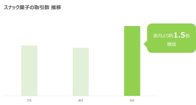 スナック菓子の取引数は、前月より約1.5倍増加しました。ビール同様、スナック菓子も段ボールでの箱買いや詰め合わせでの購入が多く、1回あたり1,600円前後で取引されています。