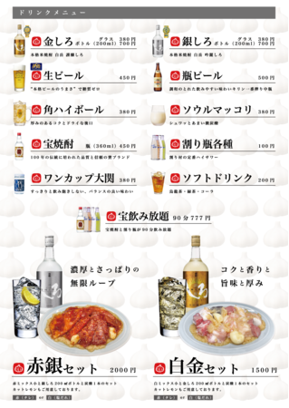 にんにく焼肉のお供としてお気軽にお試しいただける赤銀セット(2000円)と白金セット(1500円)もご用意しておりますので是非ご賞味ください。