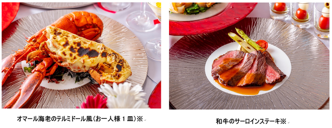 「クリスマススペシャルビュッフェ」のディナータイムの目玉商品はハレの日にかかせない「オマール海老のテルミドール風」。シェフが直接足を運び、買い付けてきたオマール海老をハーフにし、殻をお皿に見立てマッシュルームをはじめ、きのこや肉厚のオマールを一口大にカットした身肉を載せ、ホワイトソースと合わせています。1つの殻の中で風味と旨味が楽しめるテルミドールはフェスティブシーズンの気分を盛り上げるメニューの一つです。