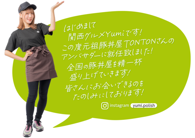 全国への出店が続く「元祖豚丼屋TONTON」では、注目を集めるグルメガールYumiさんをアンバサダーとして迎え、強力なサポーターとして様々な活動おこなってまいります。