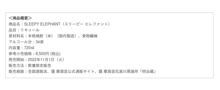 薩?摩酒造株式会社(代表取締役社長:本坊愛一郎、本社:鹿児島県枕崎市)は、薩?摩酒造の貯蔵庫に眠る、超長期貯蔵の本格焼酎をベースにしたリキュール「SLEEPYシリーズ」の第三弾として、本格米焼酎の原酒を使用した『SLEEPY ELEPHANT (スリーピー エレファント)』を2022年11月1日 (火) よりメーカー出荷し、数量限定で全国発売します。