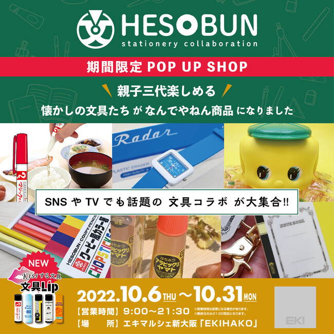 マジックインキ、フエキ糊、Radar、よいこのおどうぐばこ、ツバメノート、アラビックヤマトなど、有名文具メーカーとのコラボにより新しい角度で文房具の楽しさを伝える「なるへそ!」な文具、「へそ文-HESOBUN-」のポップアップショップが、エキマルシェ新大阪 「EKIHAKO」に期間限定オープン!有名文具メーカーとのコラボ商品をはじめ、使う人が「なるへそ!」を体感できる話題のアイテムたちが大集合!雑貨やふりかけ、お菓子など、楽しいグッズを取り揃えて皆様のお越しをお待ちしております。