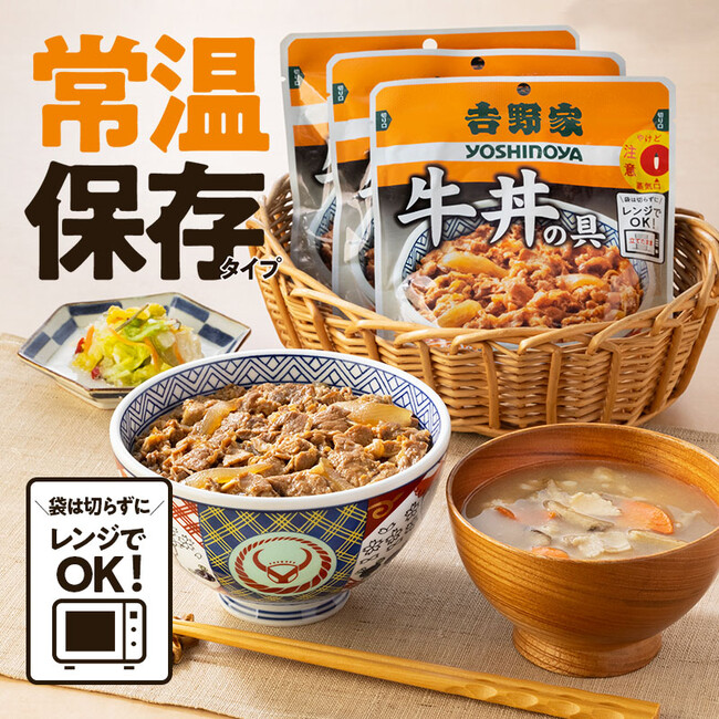 このような中、お客様からは常温で保管できるレトルトの「牛丼の具」に関して多数ご要望をいただいていました。商品開発と技術の進化が伴い、この度、吉野家公式通販ショップにて「常温保存タイプ 牛丼の具」を発売開始いたしました。常温保存タイプとなることで、保管の利便性が高く、レンジでの加熱時間が短くなりました。また、郵送で商品を配送可能なため、離島でもどこでも全国に吉野家の味を届けることができます。