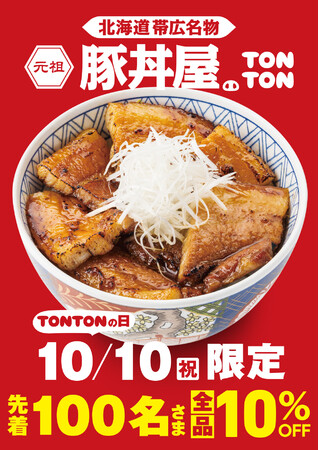本場・北海道帯広の本場豚丼をボリュームたっぷりに味わえる「元祖豚丼屋TONTON 富士吉原店」では、10/10(祝)を「TONTONの日」として、1日限定で先着100名様に全品10%オフで提供させていただきます。
