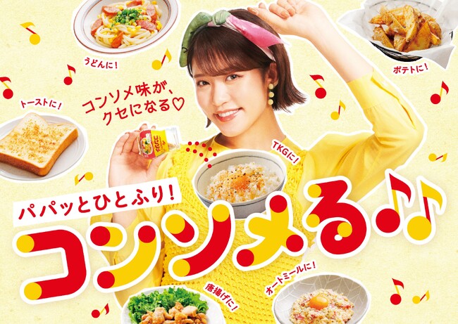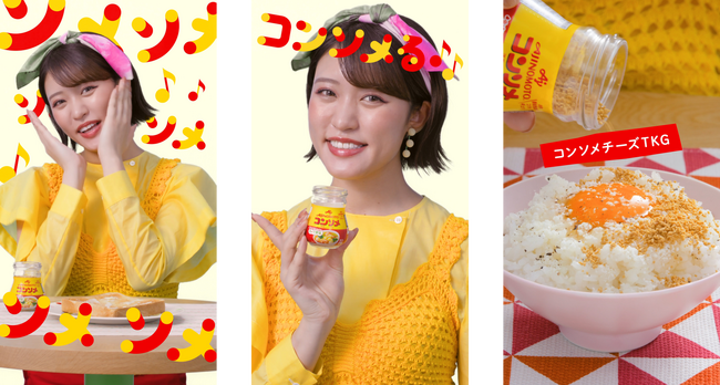 今回のためにオリジナルで制作された楽曲「コンソメる♪」の作曲には、数々のバズソングを生み出している令和のポップマエストロ「meiyo」さんを起用。「わたしはコンソメ好きすぎる♪だからなんでもコンソメる♪」という、強いコンソメ愛が感じられる歌詞からはじまり、卵かけごはん、トーストなど、仕上げにコンソメを振りかけると一段とおいしくなるメニューを紹介していきます。