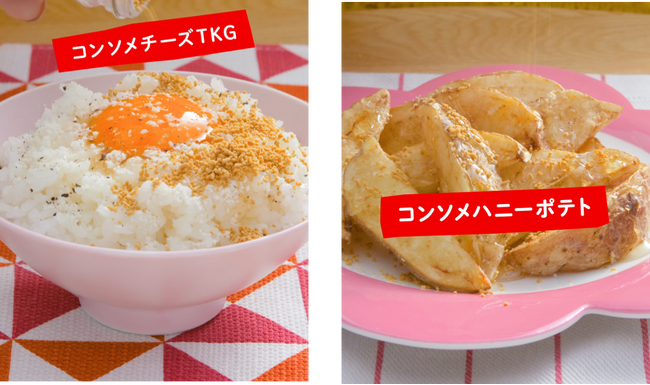 「コンソメる」とは、ごはんものや麺、からあげなど様々な料理にマッチし、ダイレクトに振りかけるだけで豊かなコクとうま味を楽しめる調味料「味の素KKコンソメ」<顆粒タイプ>を、色々なものにパパッとかけてコンソメ味にして楽しんでいただく事です。