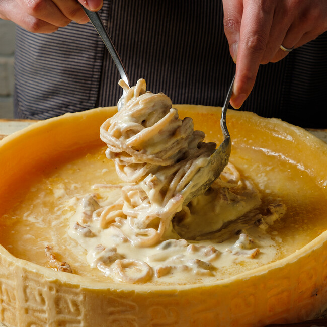Cheese Tavern CASCINA の看板メニュー「炎のカルボナーラ」はお客様の目の前で仕上げを行います。