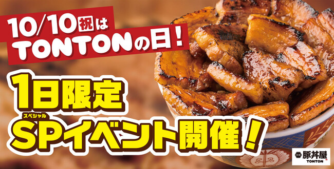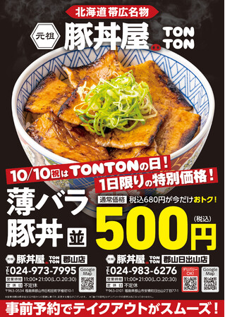 本場・北海道帯広の本場豚丼をボリュームたっぷりに味わえる「元祖豚丼屋TONTON」の郡山店(住所:福島県郡山市日和田町字植初10-1、TEL:024-973-7995)と、郡山日出山店(住所:福島県郡山市安積町日出山2-77-1、TEL:024-983-6276)では、10/10(祝)を「TONTONの日」として当店イチオシの「薄バラ豚丼【並】」を通常価格680円(税込)のところ、1日限定で特別価格500円(税込)で提供いたします。