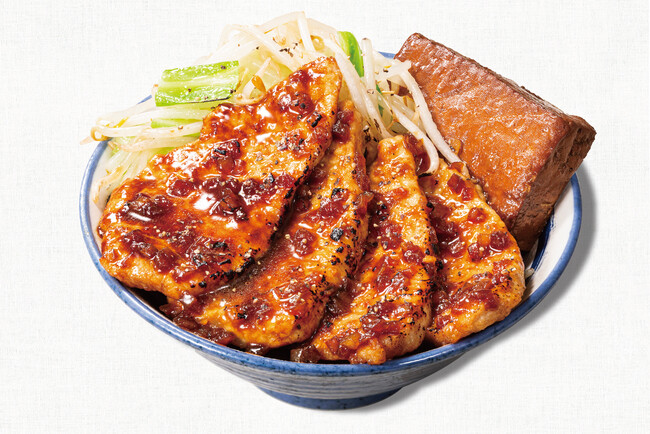 「肉テキめし」は、北米の東側から適切な温度管理の下で熟成された豚ロース肉を、ご注文をいただく度に1枚1枚丁寧に焼きあげます。厚みのある肉が香ばしさをまとったら、玉ねぎとすりおろしたにんにくを「肉めし岡もと」秘伝の割下と甘味が特徴の出汁を合わせた特製だれで仕上げ、じっくり煮込んだ豆腐と塩だれ野菜と共に丼に盛りつけます。