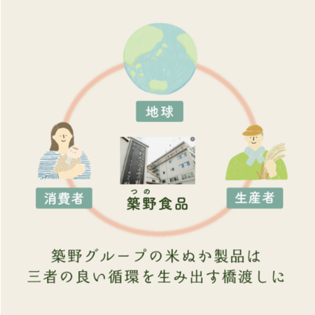 築野グループは長年、こめ油の原料である米ぬかの成分に着目し、研究を進めてまいりました。精米時に発生する副産物である米ぬかの成分を抽出することで、こめ油だけでなく食品、化学、医療、化粧品等の幅広い分野への高度有効利用をし、米ぬかの100%活用をしています。今後も国内の米ぬかを活用することで地球・生産者・消費者の良い循環の実現を目指していきたいと考えています。