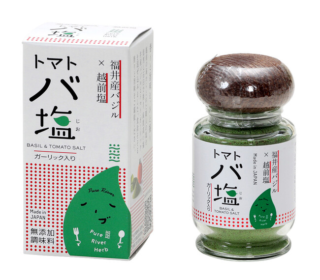 越前の海からとれた塩を焙煎して、越前職人が作った手づくり塩と福井の純度の高い国産バジルをミックスした至極の逸品。