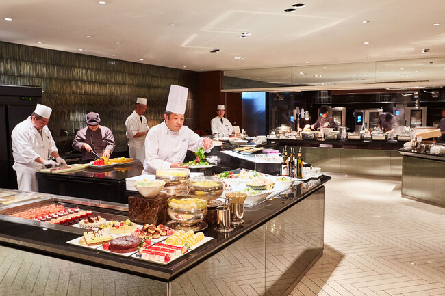 鉄板コーナーではランチタイムに鉄板で焼き上げたサクサクの食感がクセになる定番の人気メニューパリパリチキンを、ディナーでは目の前で仕上げる国産牛肉の鉄板しゃぶしゃぶを出来たてでご用意いたします。また、ライブコーナーでは、ランチライム限定で風味豊かなコクがある味わいの海老味噌ラーメンとチーズケースで仕上げたイカ墨パスタを、ディナーではウナギの炙りをのせたキノコの炊き込みご飯をご注文を受けてからシェフが目の前で調理し、出来立ての料理とともに心躍るパフォーマンスをお楽しみいただけます。