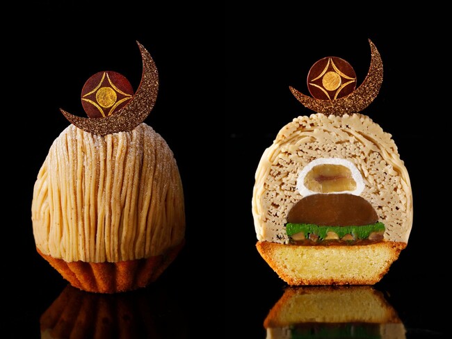 今年は、しっとりと口当たりの軽い「豆乳入りバスク生地」を土台に、ほろ苦くも甘みのある「カラメルクリーム」や渋み広がる「抹茶ガナッシュ」、和の素材として「黒蜜羊羹」を新素材として採用。さらに、熊本県産和栗の「甘露煮」を一粒と刻んだものを加え、より栗の香りと食感を堪能できる逸品に。隠し味に使用している青ヶ島の「ひんぎゃの塩」のほど良い塩味が、濃厚で優しい口当たりのマロンペーストや素材の味を引き立たせます。