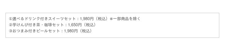 すべてのセットメニューには足湯の料金が含まれています。スイーツセット/茶・珈琲セット/ビールセットの中からお好きなセットメニューをお選びください。