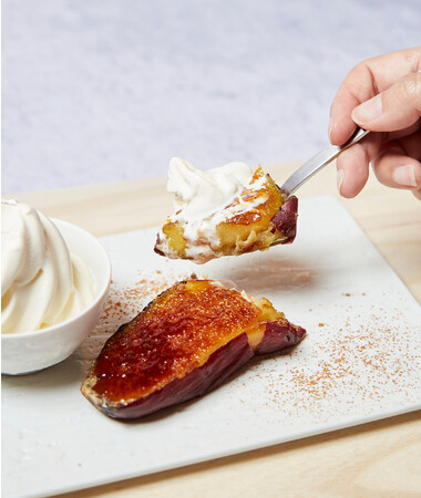 低温熟成させ、甘みを存分に引き出した焼き芋の表面をキャラメリゼした焼き芋ブリュレです。パリッとした食感と粘り気のある濃厚なお芋の味わいに、ソフトクリームが最高のマッチング。